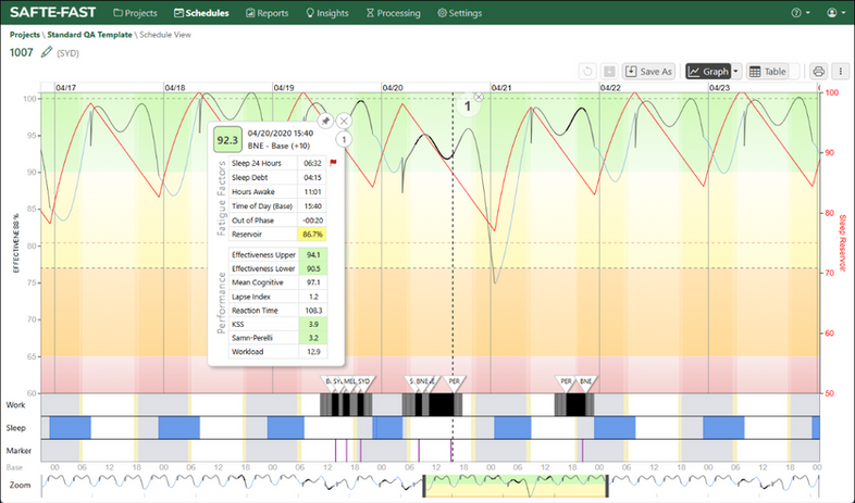 Proactive modeling leverages the SAFTE-FAST model to identify fatigue hotspots before schedules are published. By using SAFTE-FAST metrics, analysts can evaluate fatigue risk against their organizational risk tolerances early in the planning process—enabling targeted adjustments that reduce risk before schedules are assigned to crewmembers.
